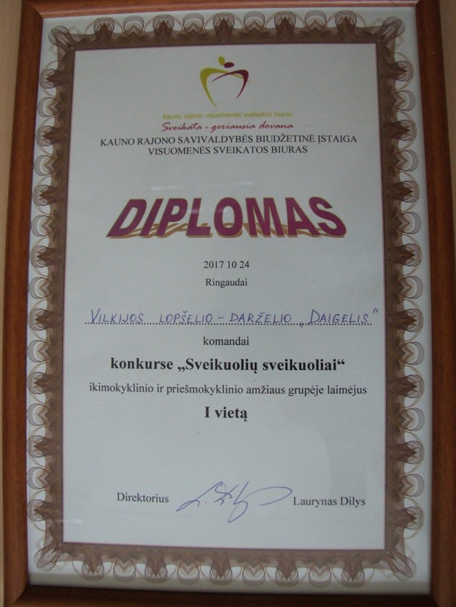 2017 m. spalio 24 d. mūsų darželio ugdytiniai su priešmokyklinio ugdymo pedagoge Vaida Vaitekūniene ir dietiste, sveikatos priežiūros specialiste, Gintare Zakarauskiene dalyvavo Lietuvos mokinių, mokytojų ir visuomenės sveikatos priežiūros specialistų konkurse ,,Sveikuolių sveikuoliai“.